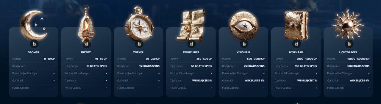 Het Loyalty Program bij ReveryPlay is gebaseerd op Comp Points: 1 punt wordt toegekend voor elke €20 aan inzet. Vervolgens begint de opmars door de niveaus — van Dreamer en Believer tot Sovereign en Legend. In de vroege stadia ontvangt de speler gratis spins, daarna worden cashback-niveaus, speciale evenementen, verjaardagscadeaus en grote rankbonussen ontgrendeld. De hogere niveaus zien er bijzonder aantrekkelijk uit: Virtuoso geeft een rangbonus van € 500 en 10% dagelijkse cashback, Guardian — € 2.500 en 12%, Oracle — € 7.500 en 15%, Sovereign — € 12.500 en 20%, en Legend — € 20.000 en 25% dagelijkse cashback.