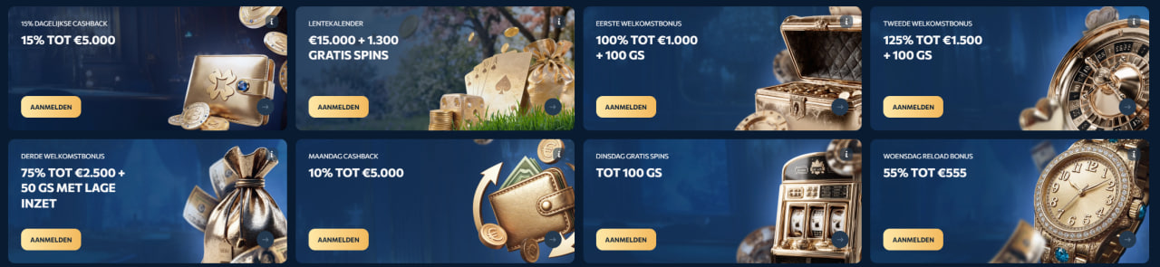 - Spring Calendar — tot € 15.000 + 1.300 gratis spins. Een grote seizoensactie die eruitziet als een volwaardige bonusmarathon met een reeks activeringen en dagelijkse redenen om in te loggen.
